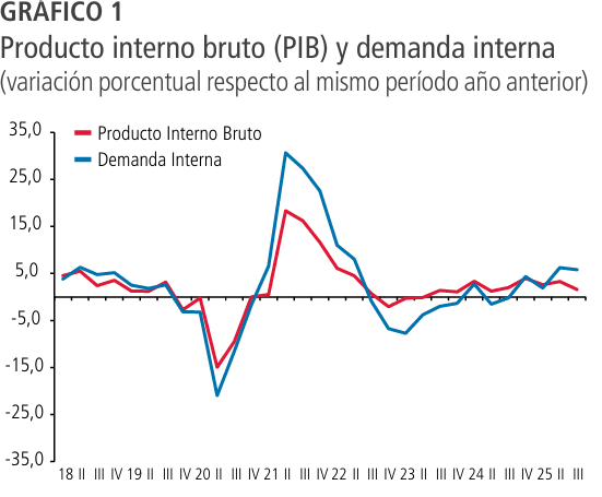 El PIB del tercer trimestre del 2025 anotó un crecimiento de 1,6% a 12 meses siendo 0,2pp menor a lo proyectado por el mercado (1,8%) siendo este el menor desempeño desde el Q2 2024 (1,2%).