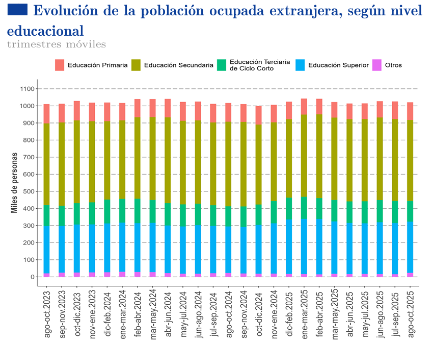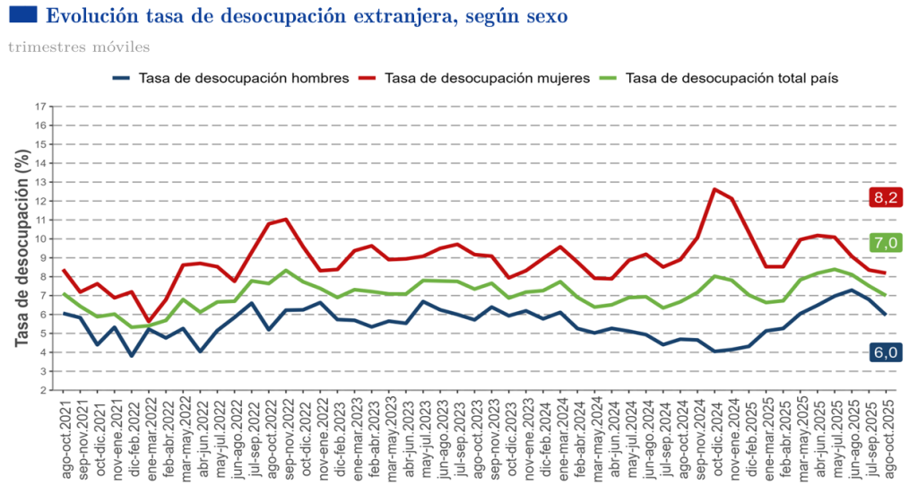El mercado laboral para la población extranjera en Chile mostró tendencias mixtas y un aumento en el desempleo durante el trimestre móvil que abarca agosto, septiembre y octubre de 2025 (ASO 2025).