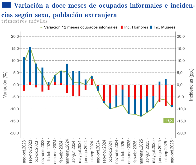 - Esta baja fue impulsada por una disminución del 9,3% en el número absoluto de personas extranjeras ocupadas informales.